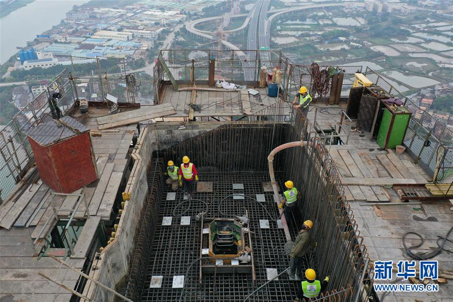 3月18日,施工人员在广州南沙港铁路跨西江斜拉桥东主塔进行封顶施工(无人机照片)。新华社记者刘大伟摄