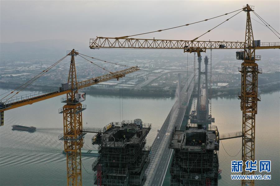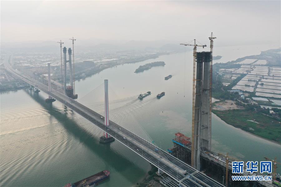 3月18日拍摄的广州南沙港铁路跨西江斜拉桥主塔封顶施工现场(无人机照片)。新华社记者刘大伟摄
