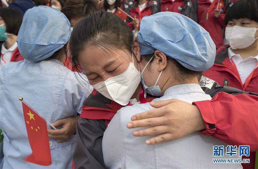 3月21日,武汉市第一医院的医护人员(前)与天津市医疗队队员李梅拥抱道别。新华社记者费茂华摄