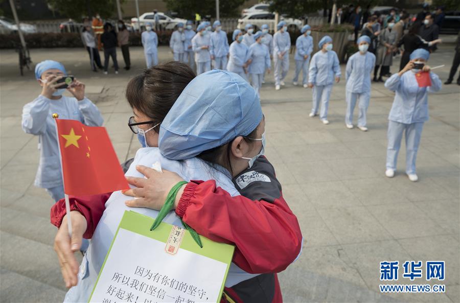 3月21日,武汉市第一医院的医护人员(前)送别天津市医疗队队员。新华社记者费茂华摄