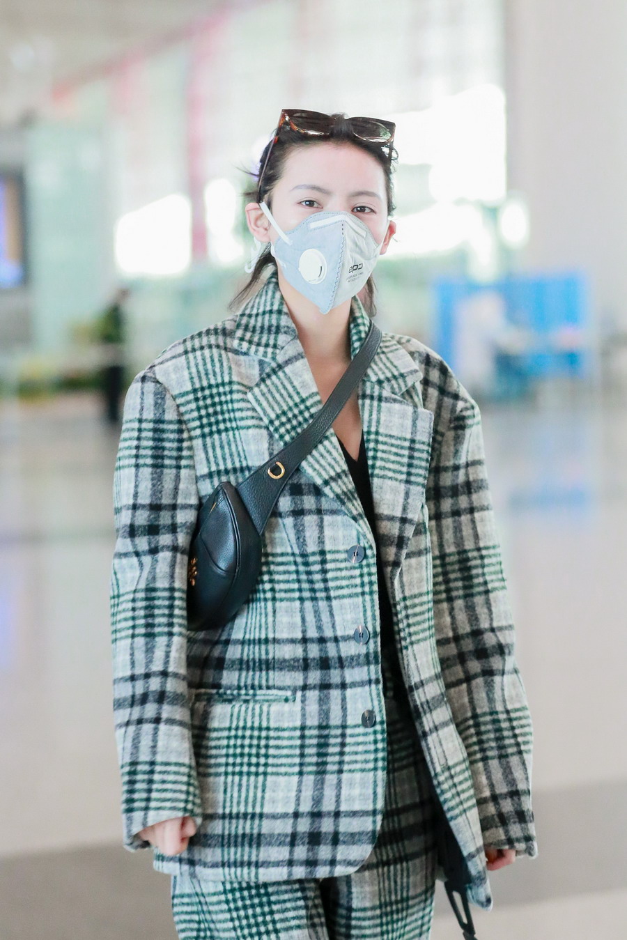张予曦扎丸子头穿格子西装又美又飒 搭配斜挎小包潮范十足