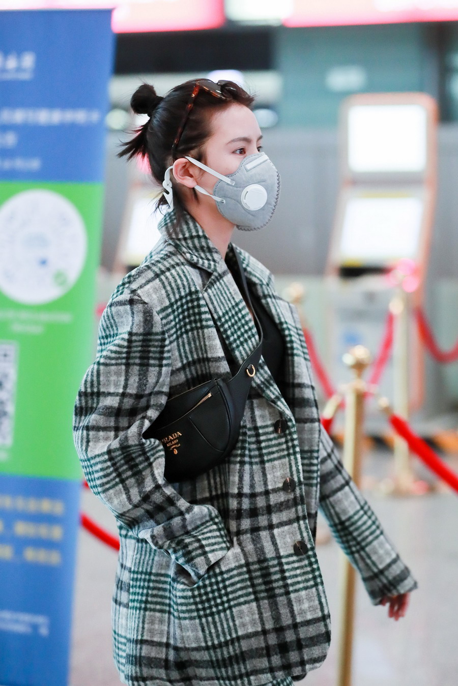 张予曦扎丸子头穿格子西装又美又飒 搭配斜挎小包潮范十足