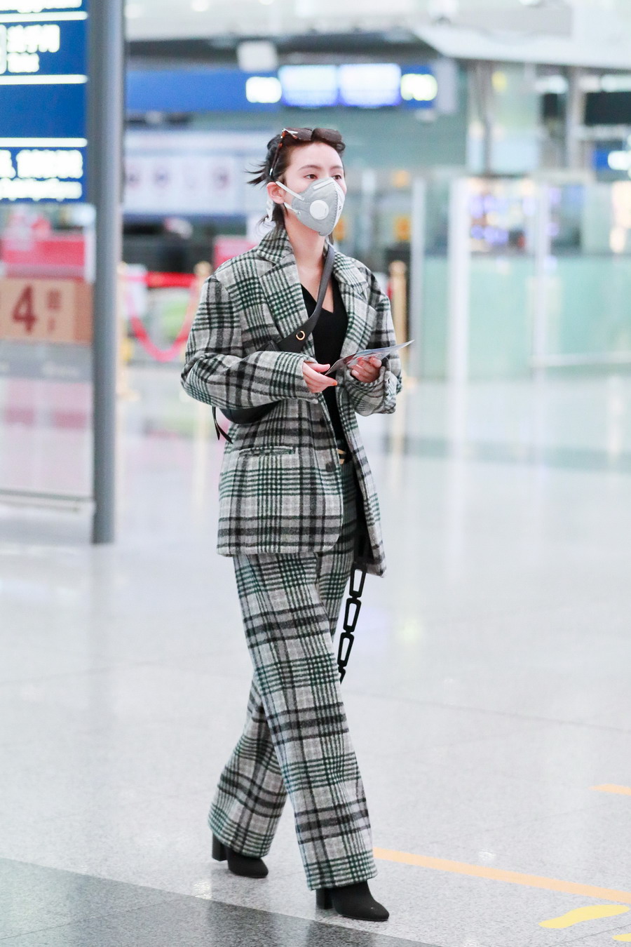 张予曦扎丸子头穿格子西装又美又飒 搭配斜挎小包潮范十足