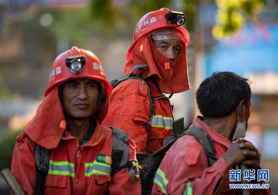 3月31日,几名刚从火灾现场撤下来的扑火队员在休整。新华社记者江宏景摄