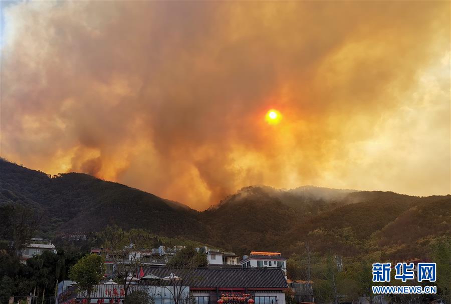 这是3月31日在四川省西昌市邛海畔拍摄的泸山火场画面。新华社记者惠小勇摄