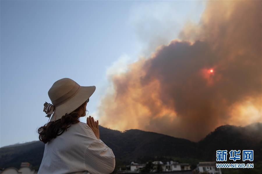 3月31日,一名女士远望着火灾现场祈祷。新华社记者江宏景摄
