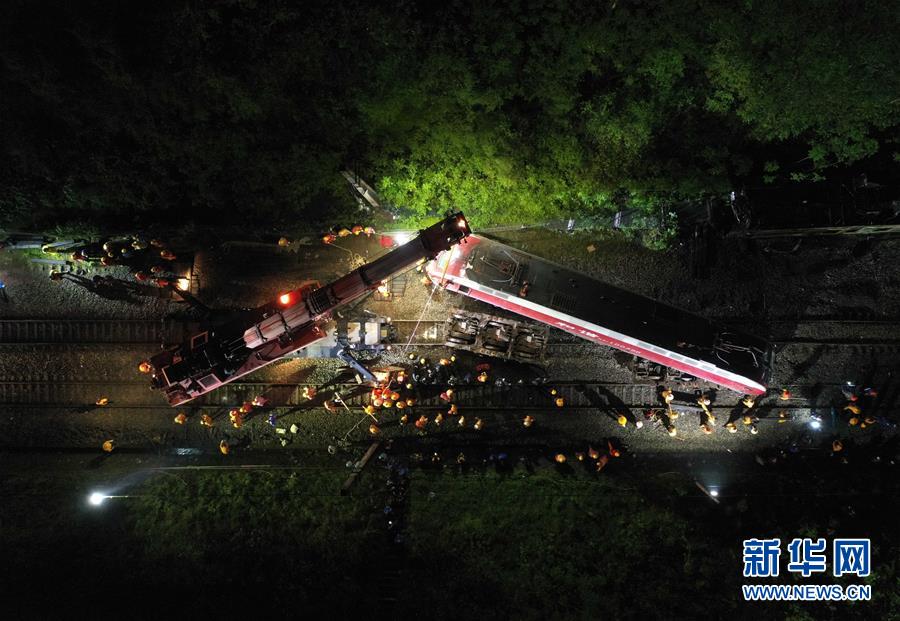 3月31日,工程车辆在T179次客运列车脱轨现场作业(无人机照片)。新华社发(陈振海摄)