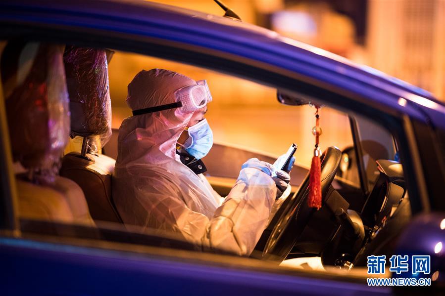 2月29日凌晨,在湖北武汉,志愿者王震在车内查看导航。 新华社记者肖艺九摄