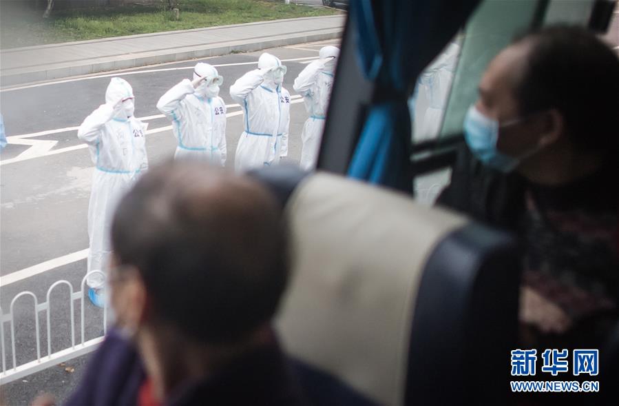 3月12日,在湖北武汉,公安民警向踏上回家路的治愈患者敬礼。 新华社记者 肖艺九 摄