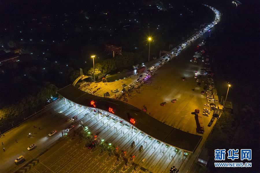 4月8日凌晨,车辆通过武汉北高速收费站(无人机照片)。新华社记者 肖艺九 摄