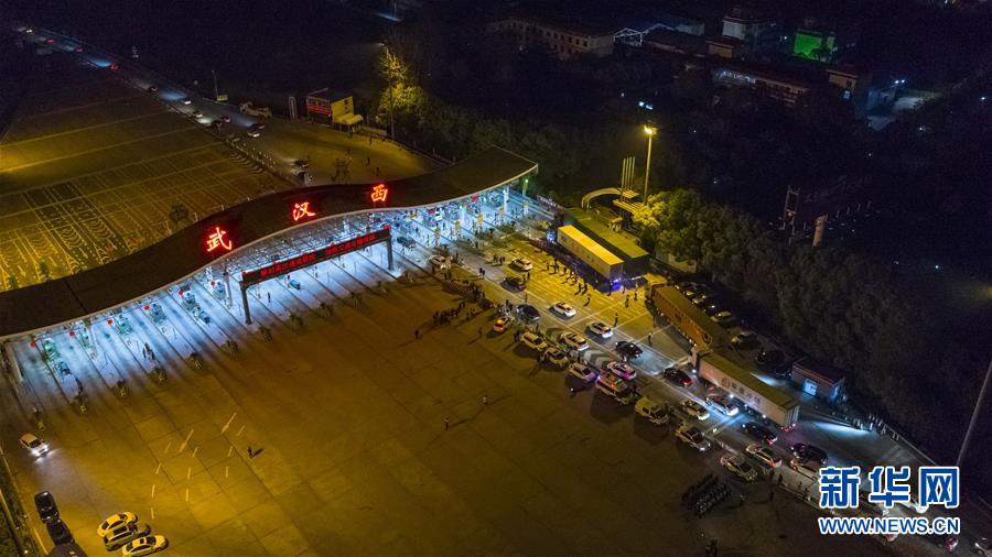4月8日凌晨,车辆通过武汉北高速收费站(无人机照片)。 新华社记者 肖艺九 摄