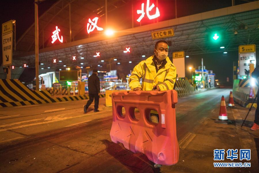 4月8日凌晨,在武汉北高速收费站,工作人员移除围栏。 新华社记者 肖艺九 摄