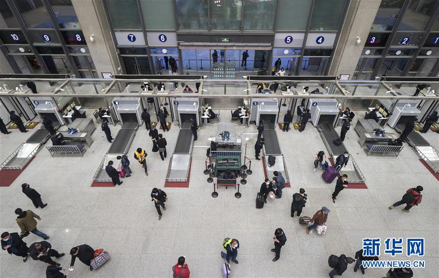 4月7日晚,旅客接受安检后进入武昌火车站。 新华社记者 费茂华 摄