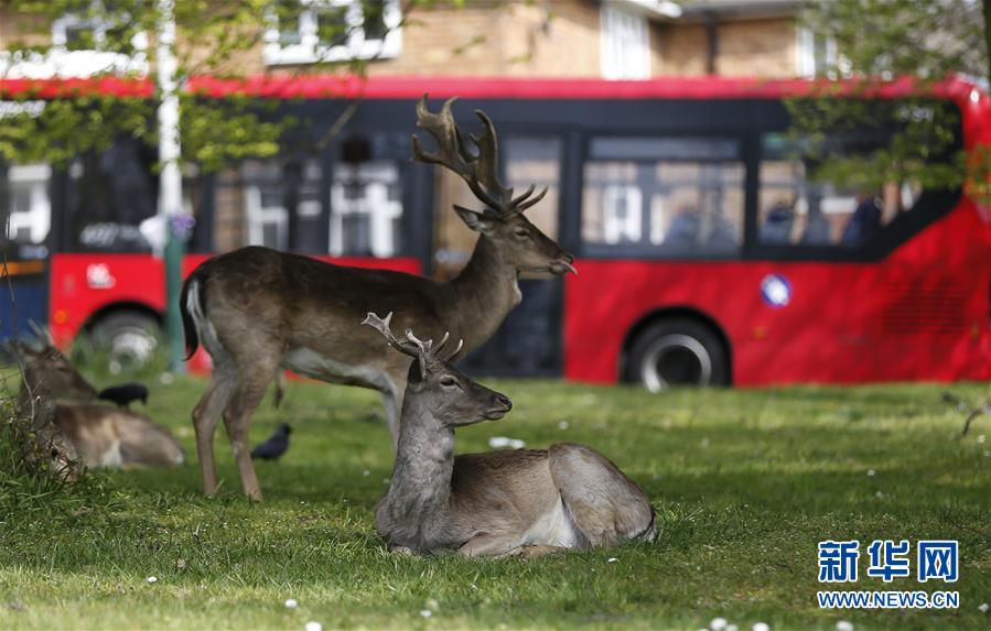 4月8日,在英国伦敦东部一个居民区,附近公园里的鹿在草坪上休息。随着新冠疫情在英国的扩散,政府要求人们减少不必要的外出。伦敦东部一个居民区附近公园里原来散养的鹿纷纷从公园走出来,或吃草或接受附近居民的喂食,成为特殊时期居民区里的新“客人”。新华社记者韩岩摄
