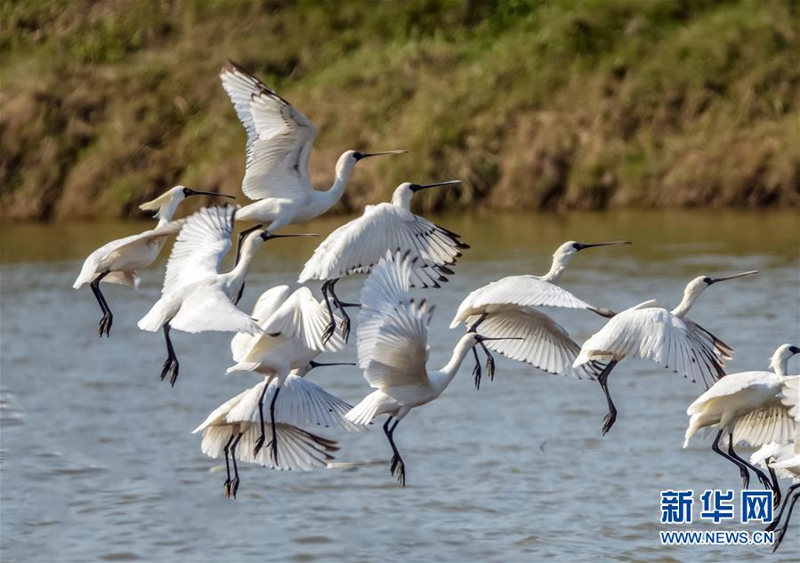 这是在福建闽江口湿地拍摄的黑脸琵鹭(4月12日摄)。新华社记者梅永存摄