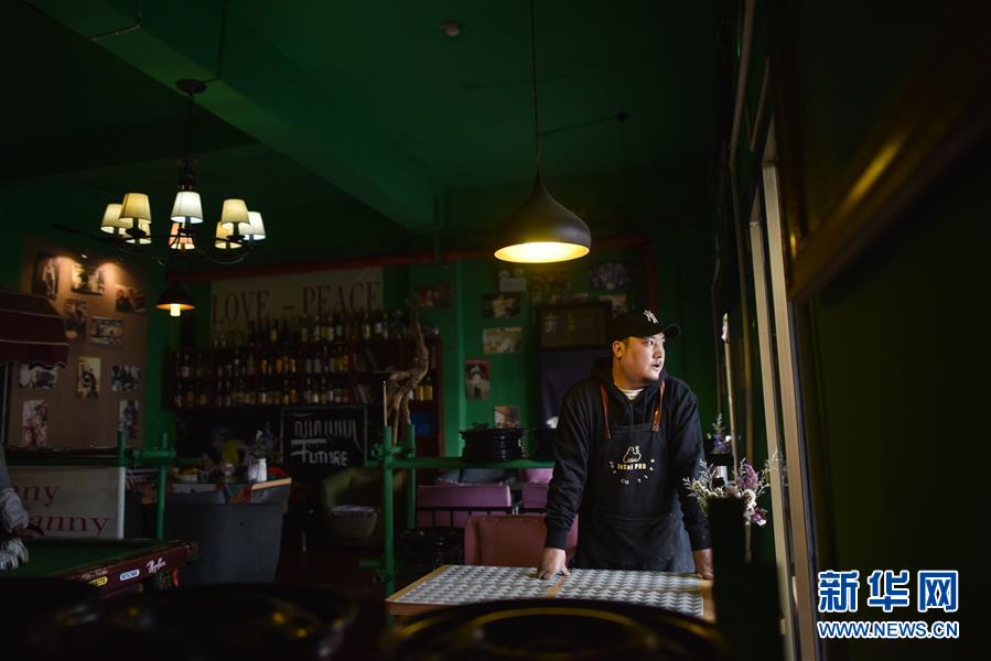 4月10日,才仁俄赛在餐厅向外张望。新华社记者吴刚摄