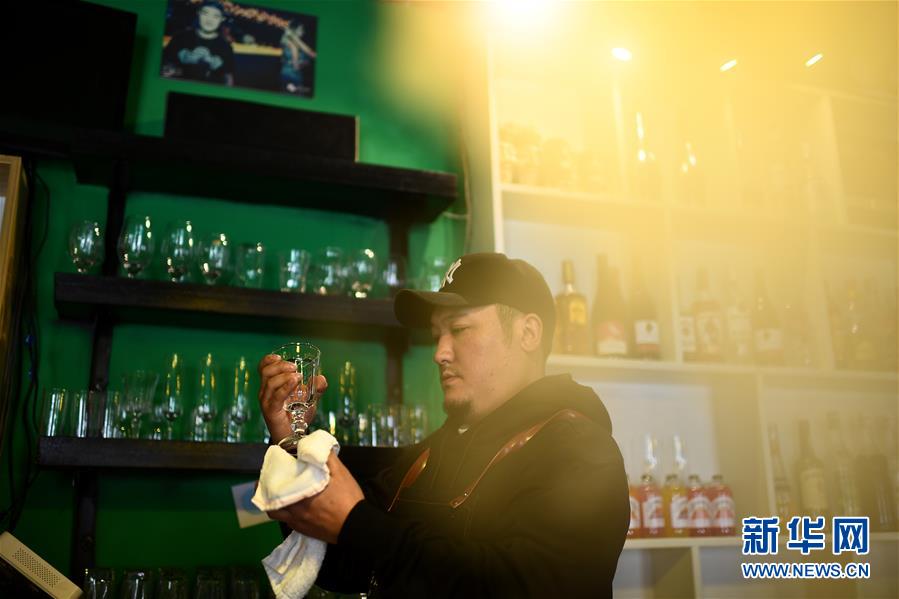 4月10日,才仁俄赛在餐厅中清洁酒具。新华社记者张宏祥摄
