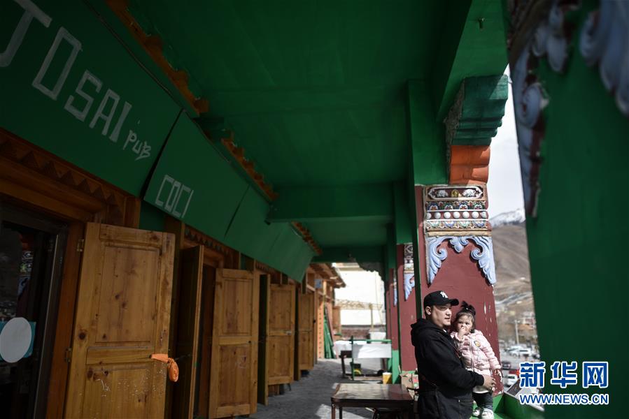 4月10日,才仁俄赛和女儿在餐厅门口远眺玉树街景。新华社记者吴刚摄