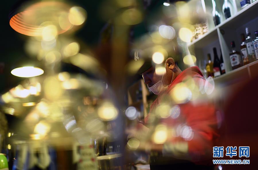 4月8日,才仁俄赛在餐厅内调酒。新华社记者张宏祥摄
