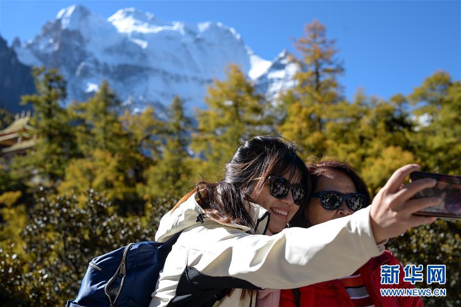 游客在亚丁景区内拍照合影(2019年10月20日摄)。新华社记者唐文豪摄