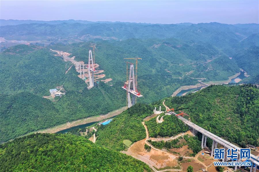这是建设中的遵余高速湘江大桥(4月26日摄,无人机照片)。近日,由中铁广州局承建的贵州遵余高速湘江大桥工程在做好疫情防控的同时,全力恢复生产建设。目前工程进展顺利,正在进行主桥钢梁架设,预计将于8月底合龙。据了解,遵余高速湘江大桥桥梁全长1700余米,主跨560米。新华社记者刘续摄