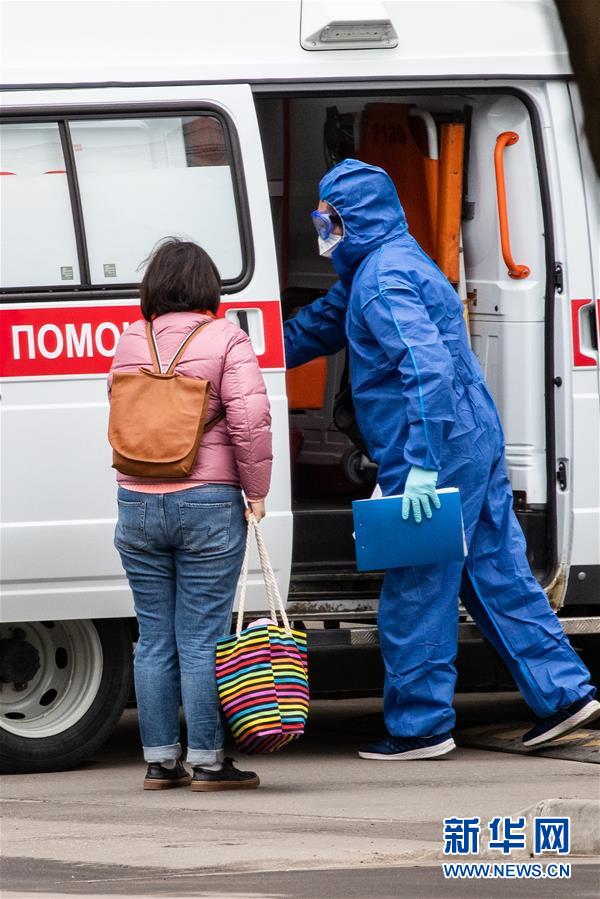 4月27日,在俄罗斯首都莫斯科,医护人员(右)引导一名女子走上救护车。据俄罗斯防疫指挥部27日消息,过去24小时俄新增新冠肺炎确诊病例6198例,累计确诊87147例,单日增幅7.66%。新华社记者白雪骐摄