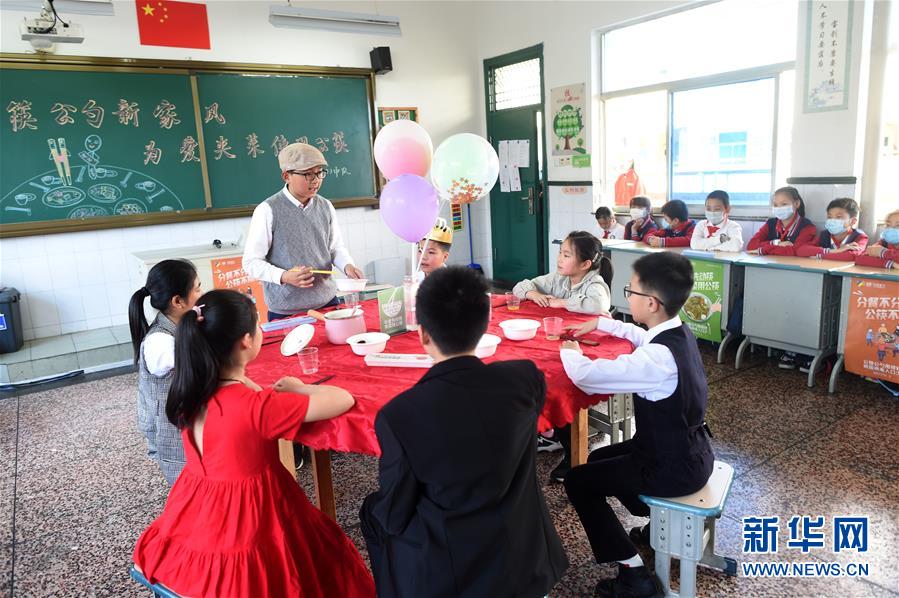 4月30日,诸暨市暨阳小学五年级4班学生在表演家庭用餐时使用公筷公勺的情景剧。当日,浙江省诸暨市暨阳小学五年级4班开展“公筷公勺新家风”主题班会活动,通过海报设计、情景剧表演等强化孩子们使用公筷公勺的意识,倡导文明用餐。新华社记者 韩传号 摄