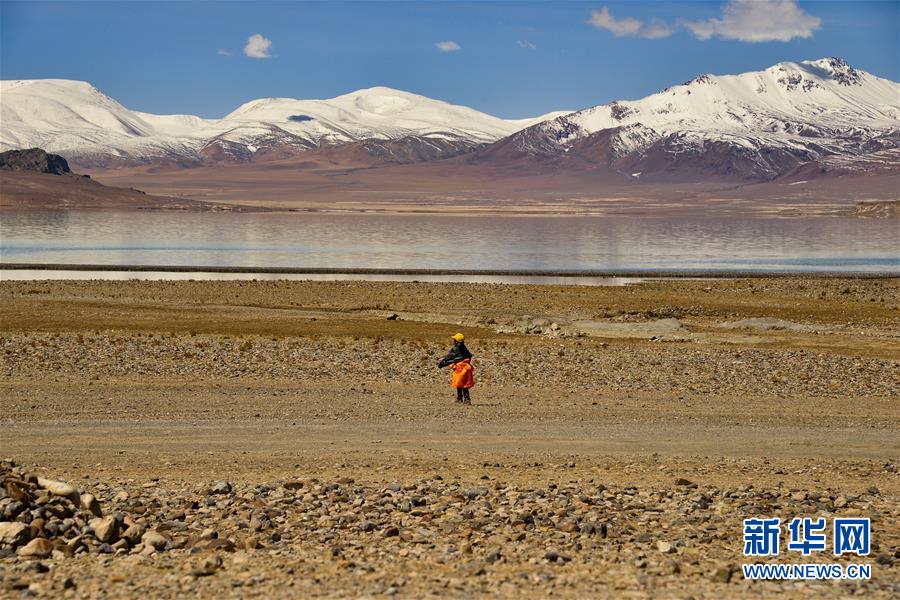 4月30日,一名藏族小孩在当穹错湖畔玩耍。当穹错地处西藏那曲市尼玛县南部,湖面海拔4475米。暮春时节,湖水碧蓝清亮,让人仿佛置身仙境。新华社记者田金文摄