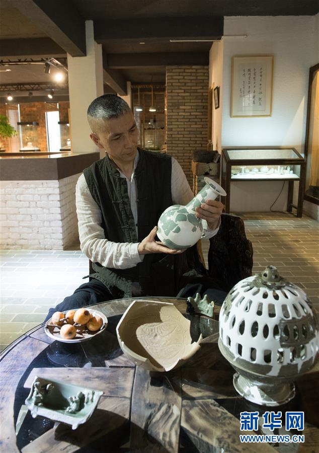 5月8日,项宏金在龙泉青瓷装饰纹样研究所查看自己收藏的一些古瓷器。1965年出生的项宏金,被浙江龙泉年轻一代瓷人称为“项哥”,他从20世纪90年代开始收集龙泉青瓷标本,研究青瓷纹样。2014年出版著作《龙泉青瓷装饰纹样》,次年开设龙泉青瓷装饰纹样研究所,将自己收藏的千余件标本跟瓷器爱好者、创作者免费分享。新华社记者翁忻旸摄