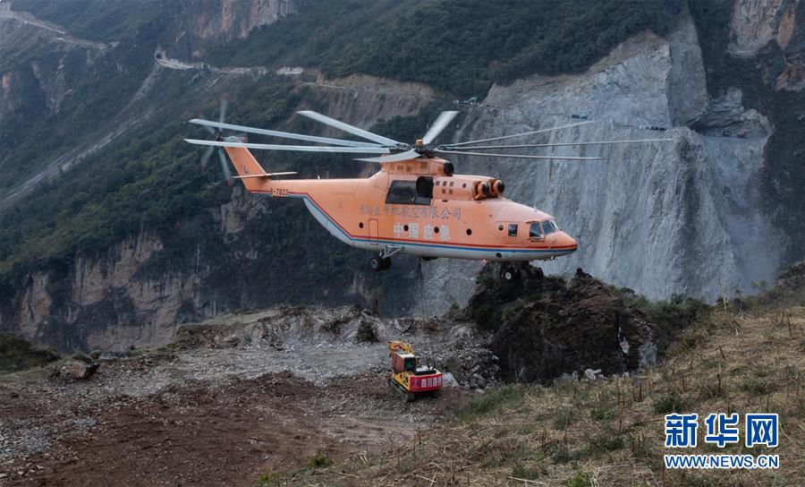 一架米-26重型直升机在布拖县阿布洛哈村吊运挖掘机(2019年12月5日摄)。新华社记者江宏景摄