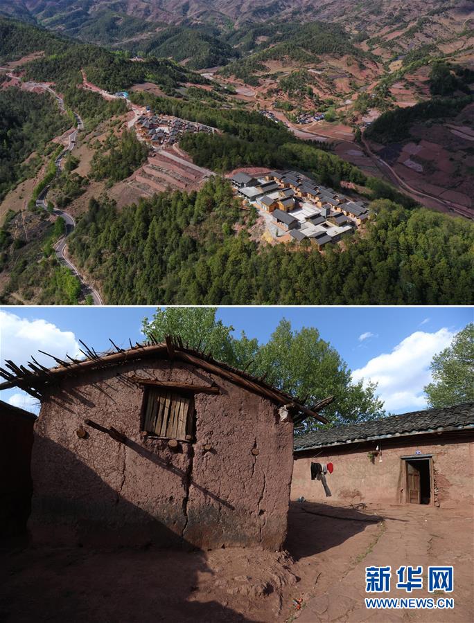 这是一张拼版照片,上图为:昭觉县三岔河乡三河村一个易地扶贫安置点(2020年4月20日摄,无人机照片);下图为:昭觉县三岔河乡三河村村民原来居住的土坯房(2020年4月20日摄)。新华社记者江宏景摄