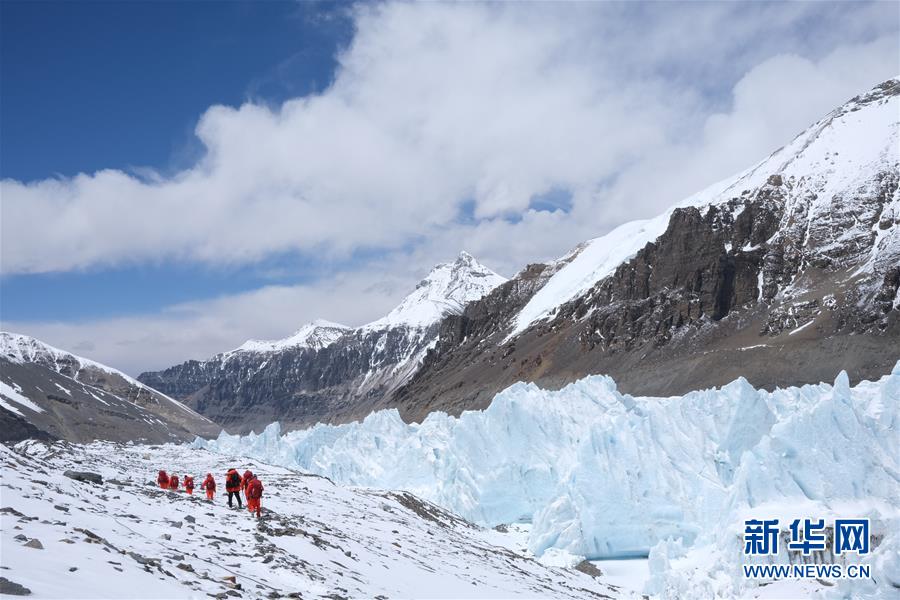 部分队员在撤回大本营途中(5月9日摄)。 因天气原因,2020珠峰高程测量登山队将分两批从海拔6500米的前进营地撤回大本营进行休整。修路队和运输队继续留在前进营地等待好天气,以通过北坳冰壁,完成修路和运输任务。根据研判,此次登顶测量时间将比原计划推后。 新华社记者 孙非 摄