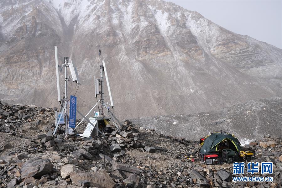 过渡营地附近的中国移动基站(5月8日摄)。珠峰过渡营地海拔5800米,是连接前进营地和珠峰大本营的重要一站。登山爱好者从大本营徒步大约四个小时就能抵达过渡营地。此段路程乱石林立,同时也能欣赏壮美的冰川。新华社记者孙非摄