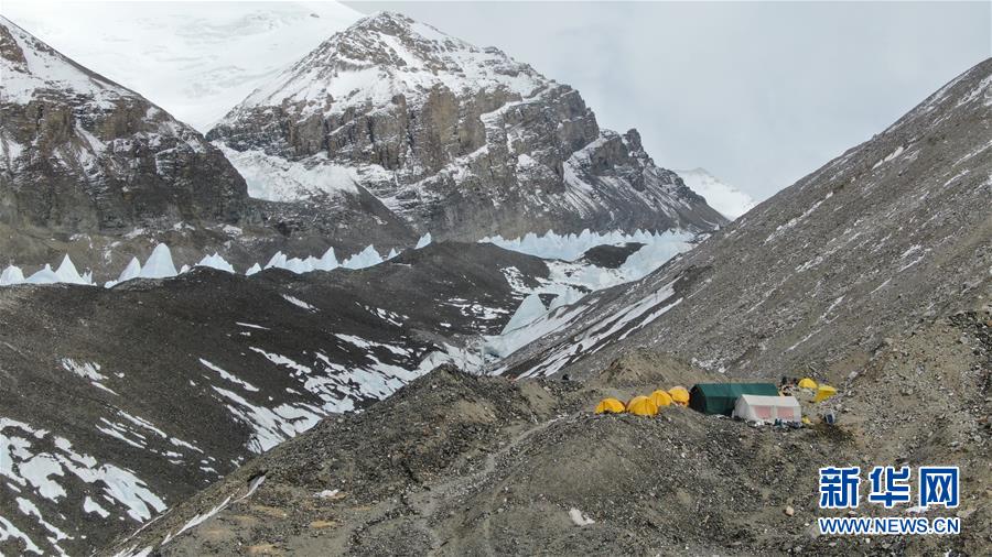 这是海拔5800米的过渡营地(5月8日摄,无人机照片)。珠峰过渡营地海拔5800米,是连接前进营地和珠峰大本营的重要一站。登山爱好者从大本营徒步大约四个小时就能抵达过渡营地。此段路程乱石林立,同时也能欣赏壮美的冰川。新华社记者孙非摄