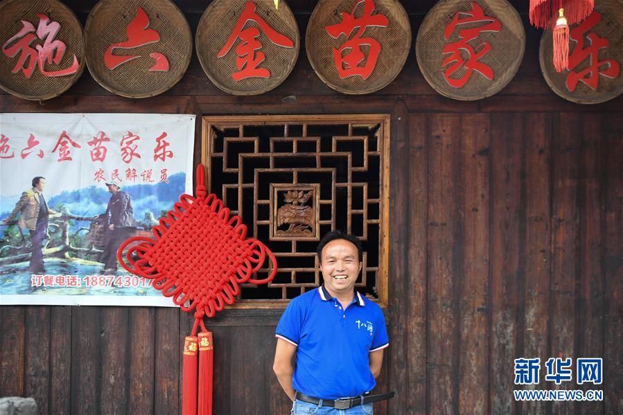 这是施六金在他的农家乐前留影(4月25日摄)。1973年出生于十八洞村的施六金,由于父亲患病很早就放弃学业和母亲扛起了家庭的重担。为了生活,他还曾远去东南亚打工。2015年,看到家乡的变化,施六金回到村里开起了农家乐,年度家庭人均纯收入也从2014年的1715元增长到了2019年的35696元。2018年,施六金与心爱的人组建了家庭。今年初,施六金与爱人迎来了一个大胖小子。“做人做事要懂得回报和感恩。”施六金给刚出生的儿子取名施泽恩。新华社记者薛宇舸摄