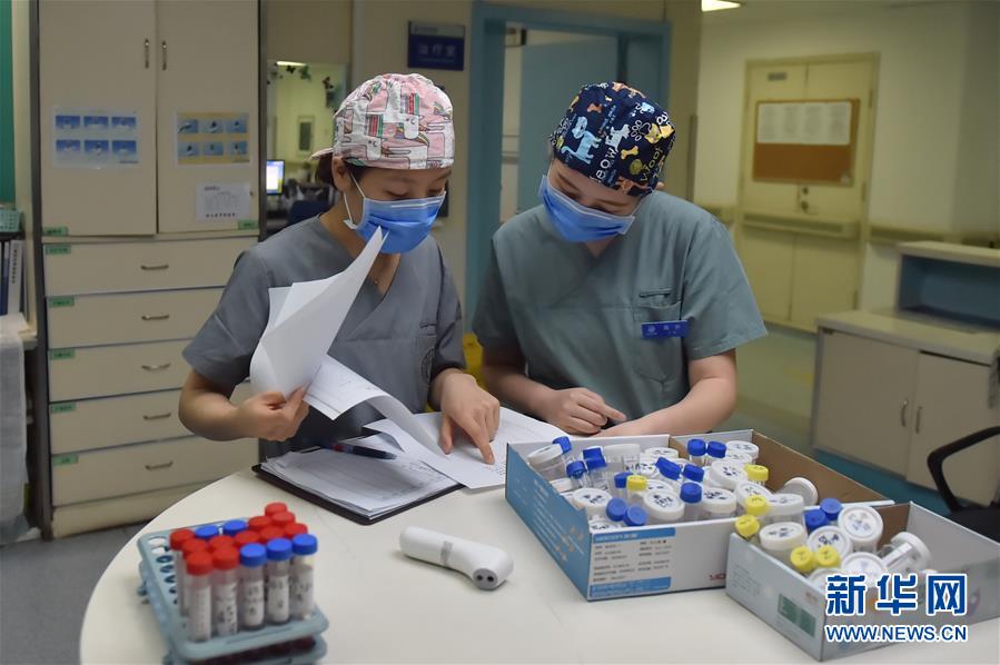 5月11日,在北京地坛医院感染二科护士站,护士王蕊(左)和石淼在整理病人的核酸样本。北京地坛医院是北京市收治新冠肺炎患者的定点医院之一,医院的医护人员一直奋战在抗击疫情的一线。在国际护士节前夕,记者前往北京地坛医院,记录下抗疫一线护士的日常工作状态。新华社记者彭子洋摄