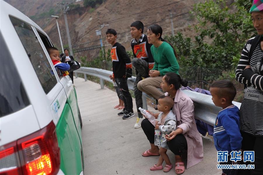 5月12日,四川省昭觉县阿土列尔村第一批26户贫困户坐上开往昭觉县易地扶贫搬迁县城集中安置点的新家,与其他村民道别。新华社记者江宏景摄