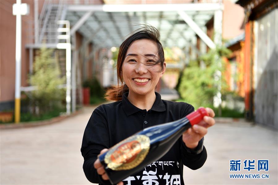 西藏芒康县藏东珍宝酒业有限公司副总经理曲措在展示一款“达美拥”葡萄酒(5月4日摄)。新华社记者詹彦摄