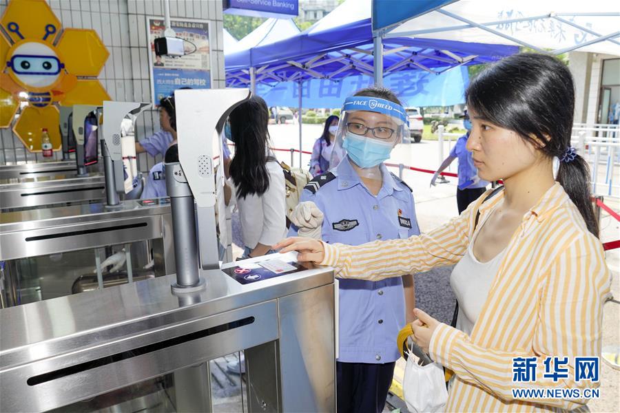 5月15日,在西南大学的返校学生专用通道内,一名学生在工作人员的指导下核对身份,接受检测。当日,重庆西南大学迎来疫情以来首批返校大学生。据介绍,按照疫情防控的需要,重庆市高校2020年春季学期从5月11日起按照“一校一策”原则,实行错峰错时分批次有序开学复课。新华社记者刘潺摄