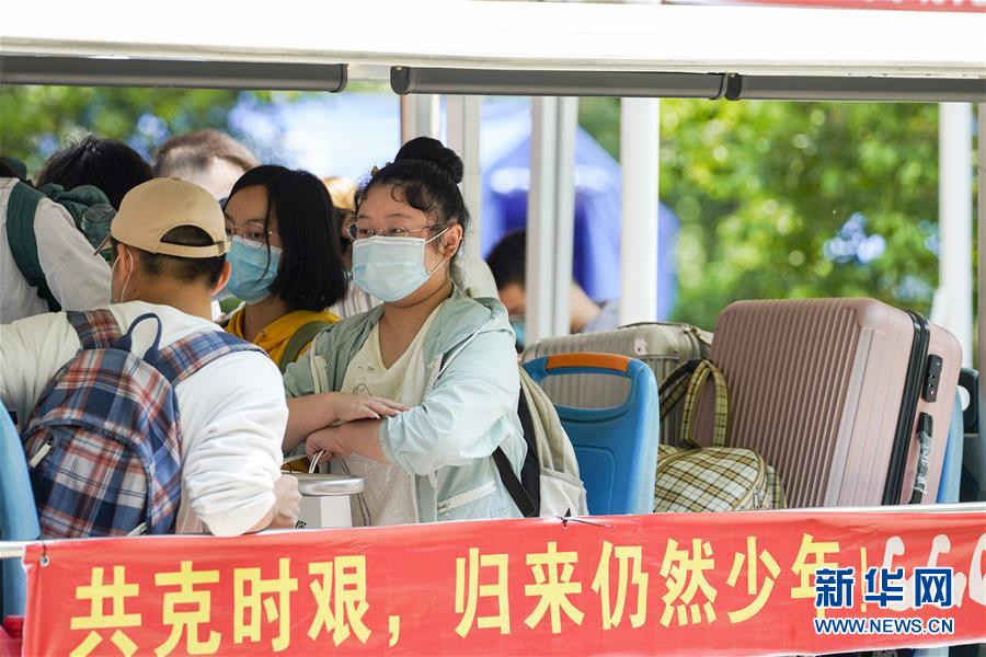 5月15日,在西南大学的返校学生报到点,学生在校内转运车上准备前往宿舍。当日,重庆西南大学迎来疫情以来首批返校大学生。据介绍,按照疫情防控的需要,重庆市高校2020年春季学期从5月11日起按照“一校一策”原则,实行错峰错时分批次有序开学复课。新华社记者刘潺摄