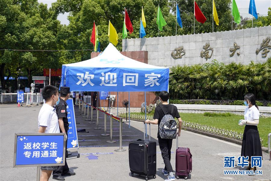 5月15日,在西南大学的返校学生专用通道前,学生按照工作人员和志愿者的引导有序进入校区。当日,重庆西南大学迎来疫情以来首批返校大学生。据介绍,按照疫情防控的需要,重庆市高校2020年春季学期从5月11日起按照“一校一策”原则,实行错峰错时分批次有序开学复课。新华社记者刘潺摄