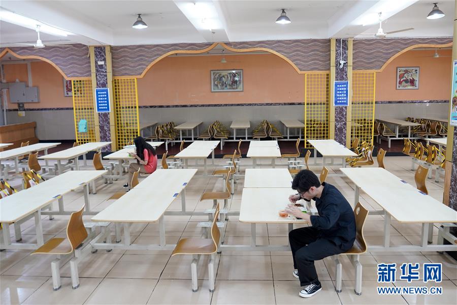 5月15日,在西南大学的一个学生食堂内,学生按照要求一人一桌吃午餐。当日,重庆西南大学迎来疫情以来首批返校大学生。据介绍,按照疫情防控的需要,重庆市高校2020年春季学期从5月11日起按照“一校一策”原则,实行错峰错时分批次有序开学复课。新华社记者刘潺摄
