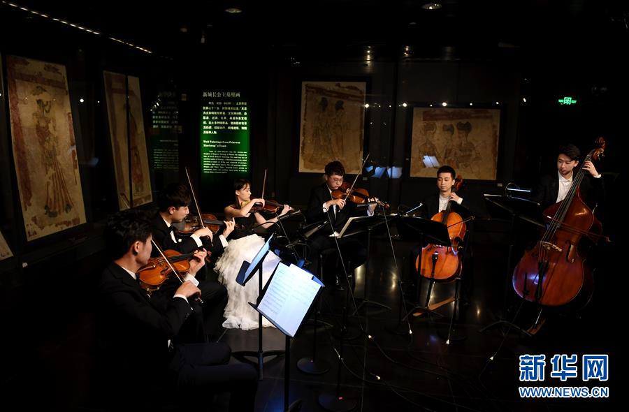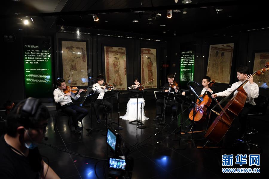 在陕西历史博物馆唐代壁画珍品馆,西安交响乐团小提琴首席周虎翼、第二小提琴首席白东旭、第二小提琴演奏员叶姣睿、中提琴演奏员时少恺、大提琴演奏员于丁和低音提琴演奏员赵子杰(从左至右)为“云上国宝”音乐会彩排(5月14日摄)。为迎接国际博物馆日,5月14日,西安交响乐团走进陕西历史博物馆唐代壁画珍品馆,为5月18日的“云上国宝”音乐会彩排。观众将通过网络直播,在聆听天籁的同时欣赏国之瑰宝,感受艺术与美的和谐共鸣。新华社记者李一博摄