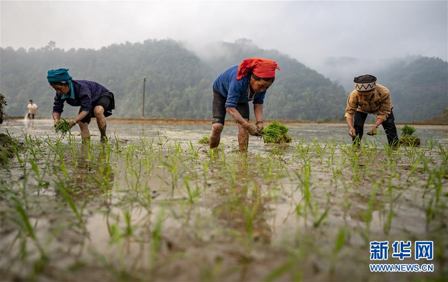 村民在地里插秧(3月26日摄)。新华社记者江文耀摄
