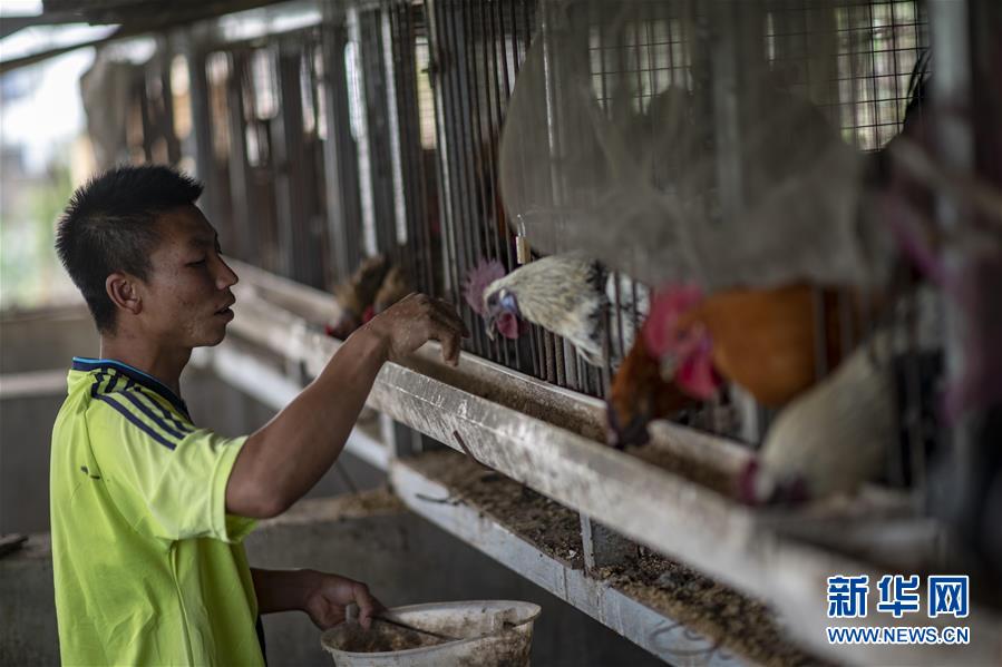 村民在统一修建的鸡舍里喂鸡(3月28日摄)。新华社记者江文耀摄