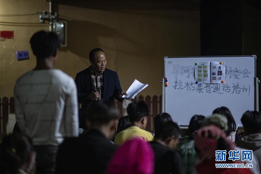 村民们利用夜间空闲时间,在院子里集体学习普通话(3月28日摄)。新华社记者江文耀摄