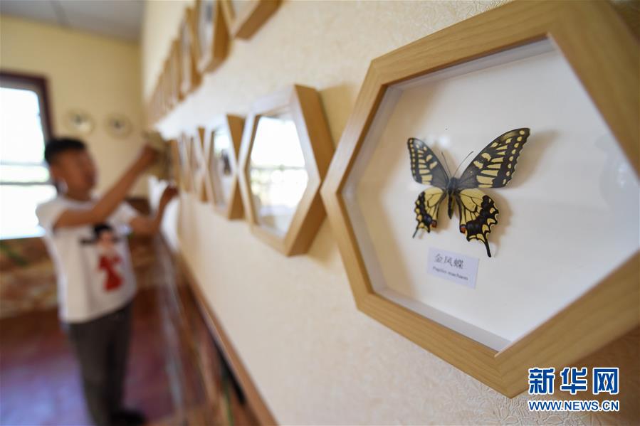 在吉木萨尔县七彩蝶园,关富云在打扫蝴蝶标本展厅(5月15日摄)。新华社记者丁磊摄