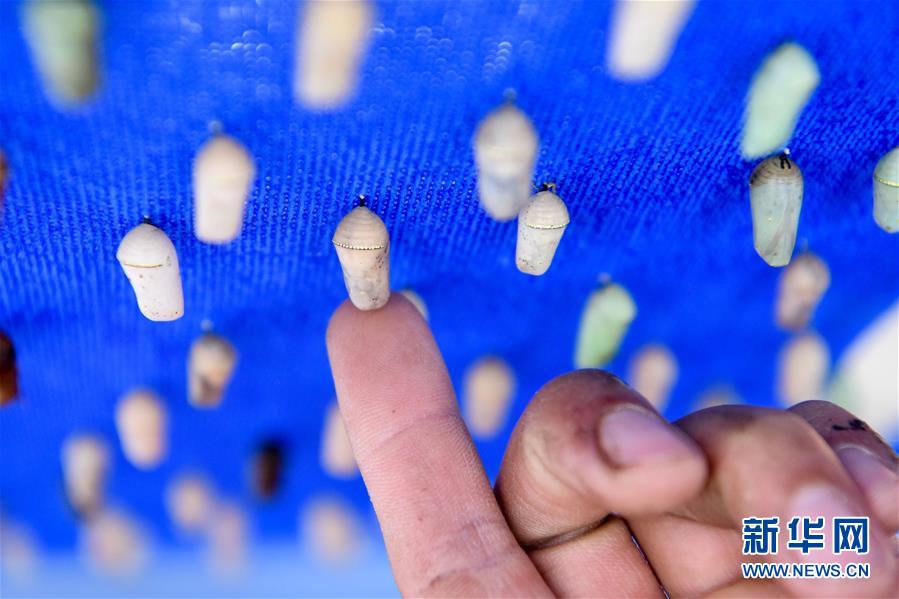在吉木萨尔县七彩蝶园,关富云查看蝶蛹生长状况(5月15日摄)。新华社记者丁磊摄