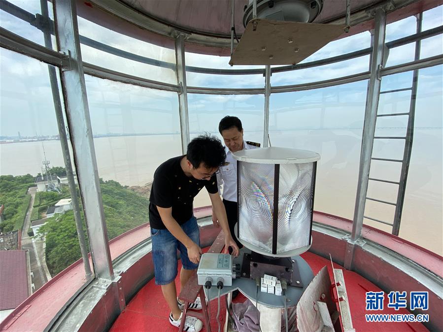 5月20日,在宁波七里屿,叶家第五代灯塔工叶超群(左)和前来运送物资的父亲叶静虎在灯塔上查看设备。叶超群2013年起在七里屿灯塔工作,叶静虎从灯塔工岗位上退下来后,目前在宁波航标处后勤事务中心工作。新华社记者翁忻旸摄