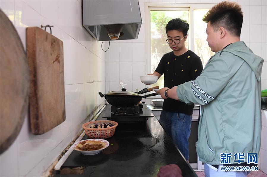 5月20日,在宁波七里屿,叶家第五代灯塔工叶超群(左)和同事叶露在厨房做饭。新华社记者翁忻旸摄